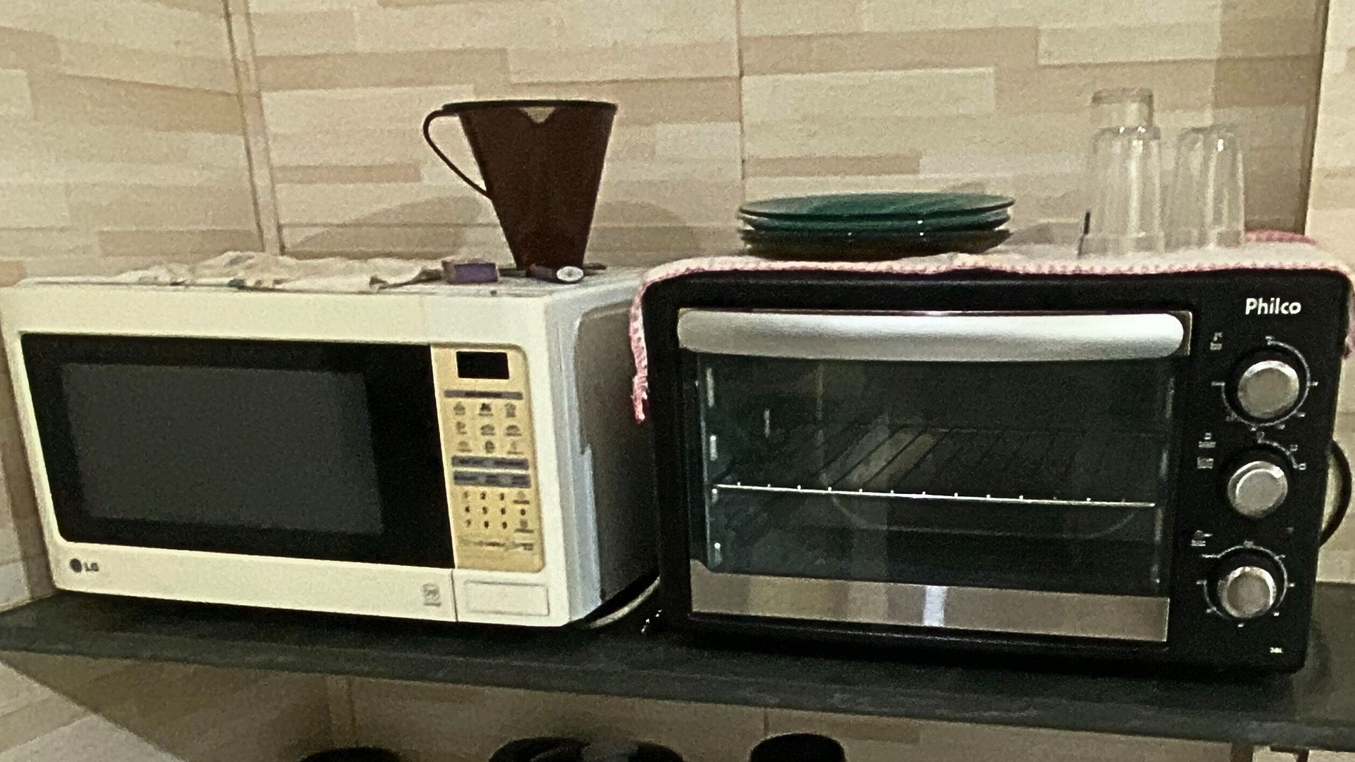 The kitchen is equipped with a refrigerator, cooktop, electric oven, blender, microwave, table with chairs, utensils, glasses, plates and pans.