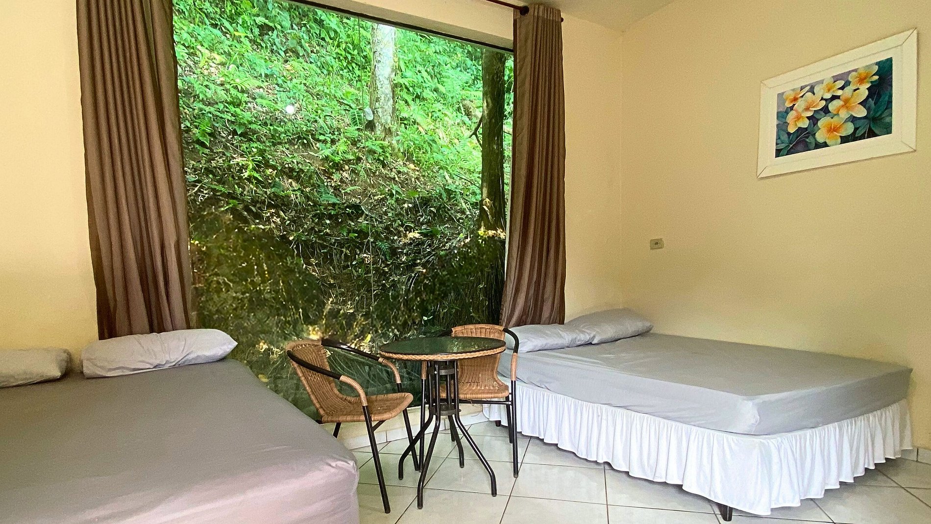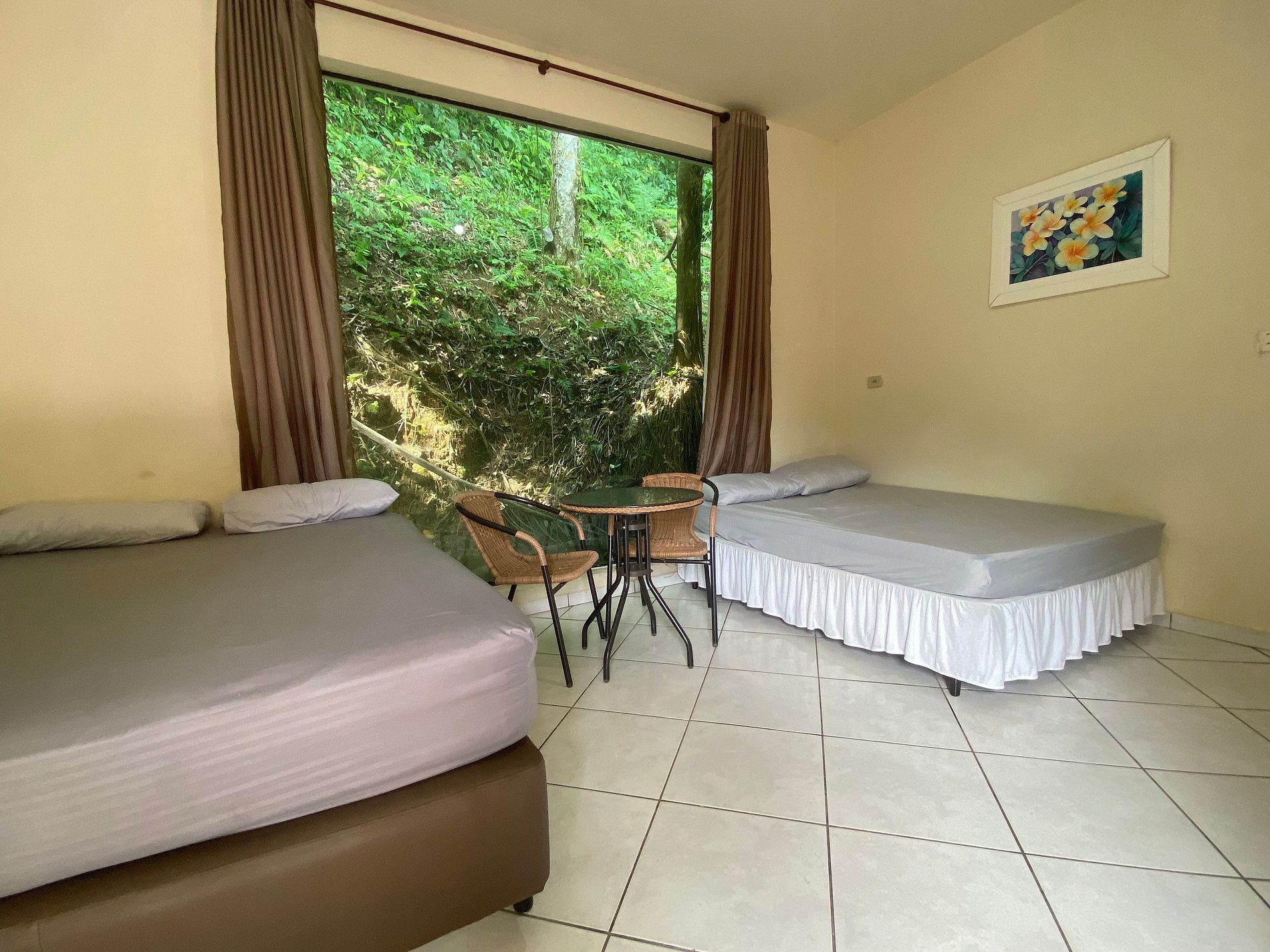 A suíte conta com ar-condicionado, TV Sky, duas camas de casal, frigobar, mesa com cadeiras e banheiro privativo.